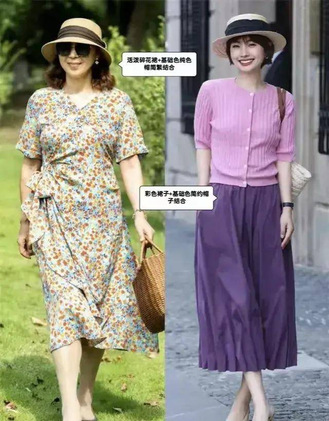 如果你是00后的美少女,或者是95后,可以向右边这位达人一样,用一款草帽搭配上粉色的针织开衫和紫色的半身裙,这样的穿衣配色更显年轻,同时修饰肤色,出门旅游拍照很出片。