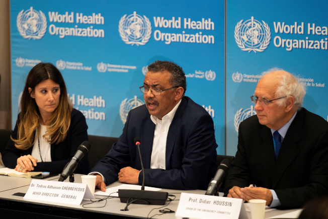 世界卫生组织秘书长谭德塞(中)多次称赞中国的防疫努力,面对中国日益严峻的疫情,专家责难谭德塞,话说早了,导致外界松懈。(路透)