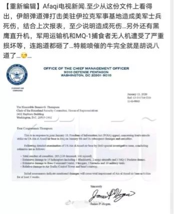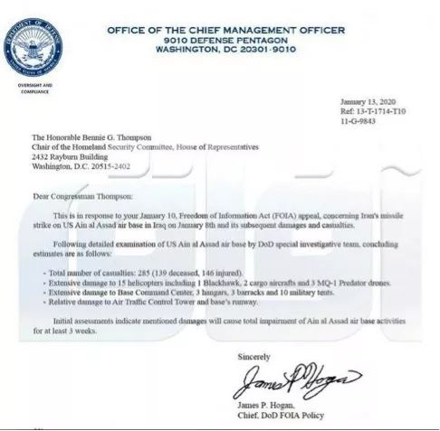 因为该网贴不仅宣称伊朗在1月8日对美军驻伊拉克基地的报复性恐袭中,实际上炸死炸伤了285名美军士兵,还拿出了一份美国国防部写给一名美国国会议员的信件作为佐证。