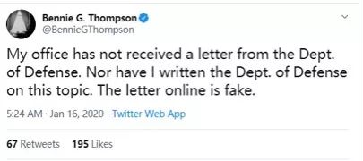 这是因为,根据多家美国媒体的报道,这封虚假信件中提到的当事人、美国国会的民主党议员Bennie G. Thompson,已经公开否认了此事。