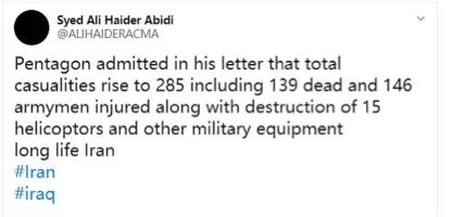 下图,便是昨晚在境外的推特和中国的微博平台上引起人们关注的那个宣称“伊朗炸死炸伤285名美军”的相关网贴。