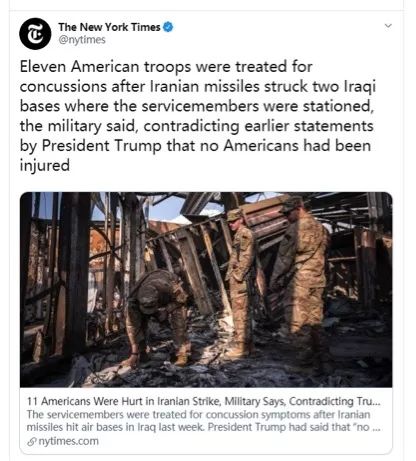 但另一方面,虽然伊朗炸死炸伤285名美军士兵的消息是虚假的,美国《纽约时报》等主流媒体今天却引用美国军方的说法称,伊朗的那次空袭确实导致了11名美军士兵受伤,并称这一情况与特朗普政府最初所宣称的美军士兵“一切安好”的说法不符。