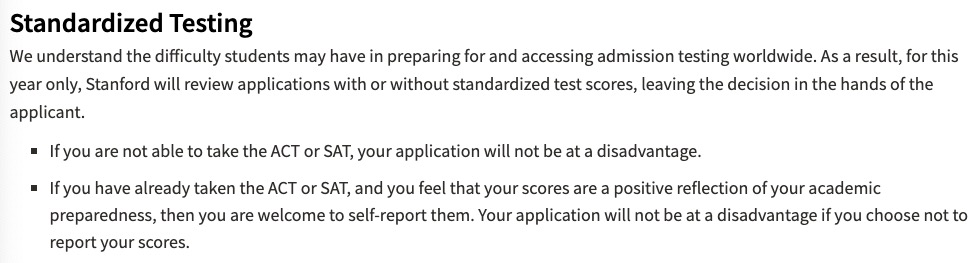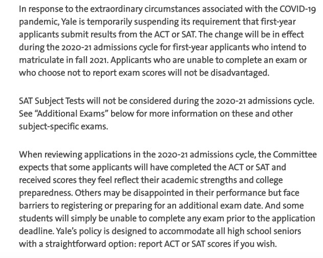 我们解读这段话,康奈尔大学的意思可以理解为:如果你无法提交或不愿意提交SAT,你可以不提交,我们也不会强制要求你提供原因,但是我们可能会问你的高中申请顾问或者其他了解你所在地区情况的人,你是否参加了考试,是的,我们完全知道你居住的地方是否有开放的考场。因此,实际上什么都没有改变,除非你或者你的支持者能够证明你的情况令人信服,否则我们期望得到一个分数。