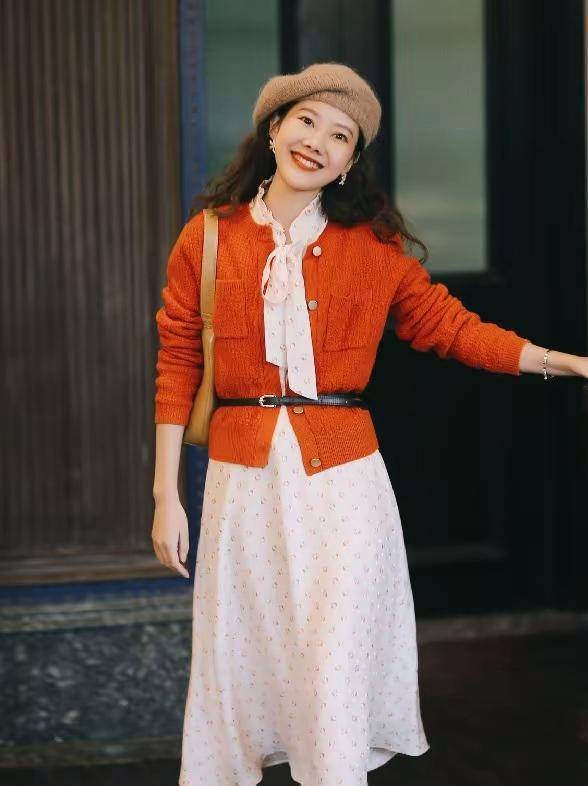 毕竟咱们的身材比例没法和时尚博主或者是女明星的身材媲美,选择适合自己身材的衣服版型,把胯宽腿粗或者是腰间的赘肉藏起来,修饰出流畅利落的身材线条感。 比如下面这一身穿搭就很不错,薄款的红色针织开衫搭配上浅粉色的印花连衣裙,两件衣服单品都属于小宽松版,为了呈现出自己的腰线,所以在腰上加了一条细款的小腰带,很轻松的就能提升腰线,又能勒住小蛮腰,抢眼又抢镜。