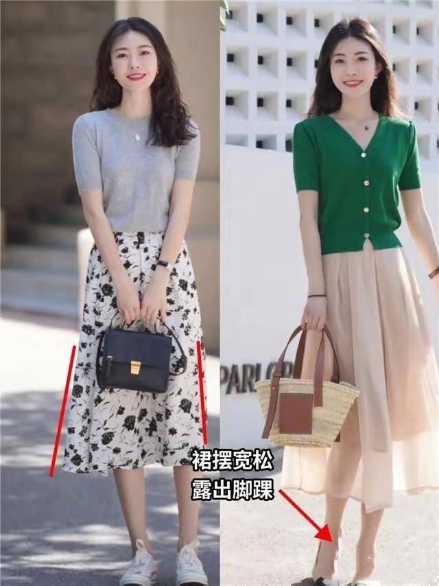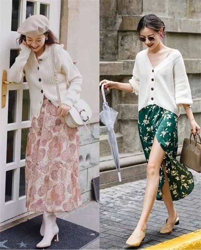 有的时候穿衣打扮过于单调,也不是那么的洋气,可以像下面这两位素人博主选择纯色系列的针织上衣,搭配上碎花的半身裙,这样就是“上简下繁”的搭配方法。 把设计复杂的碎花半身裙放在下半身视觉重心,自然就往下移了,整体一看,显得更加的精致,也不会凌乱。
