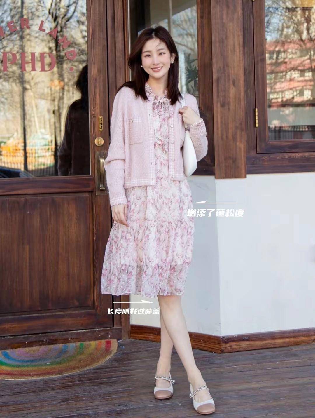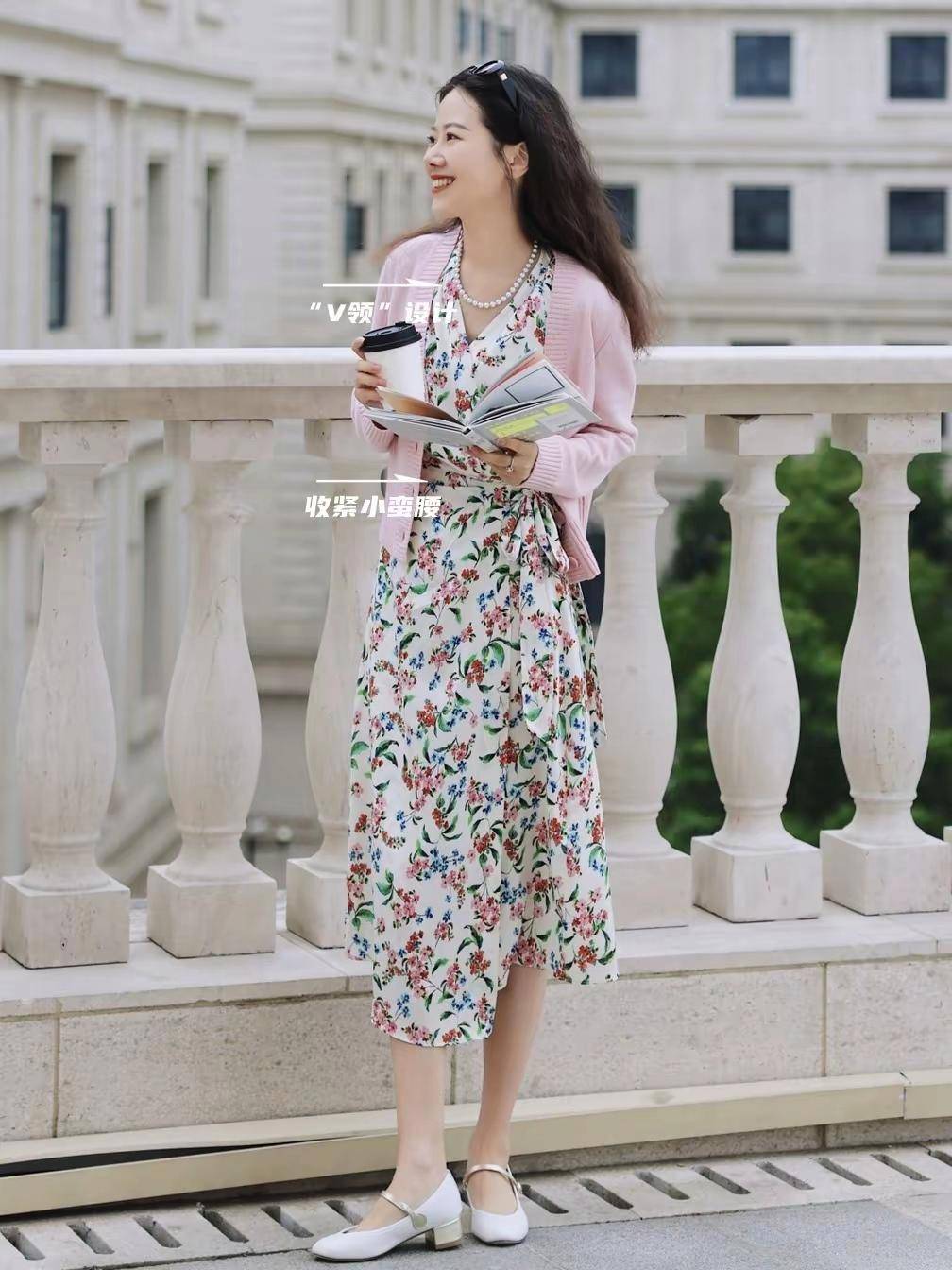 ①、一定要选好衣服版型,再利用好配饰点缀 我们一起来分析下面这位素人的穿搭,你就能明白她选择的是粉色的针织开衫,这个色调很修饰,肤色显白显嫩,更显年轻。 最重要的是里面这一条印花的离裙采用的也是V领的设计,而且还有收腰的效果,把这个腰上自带的小腰带系成一个蝴蝶结就能轻松勒出小蛮腰,又能提升腰线,整体的造型很大气。