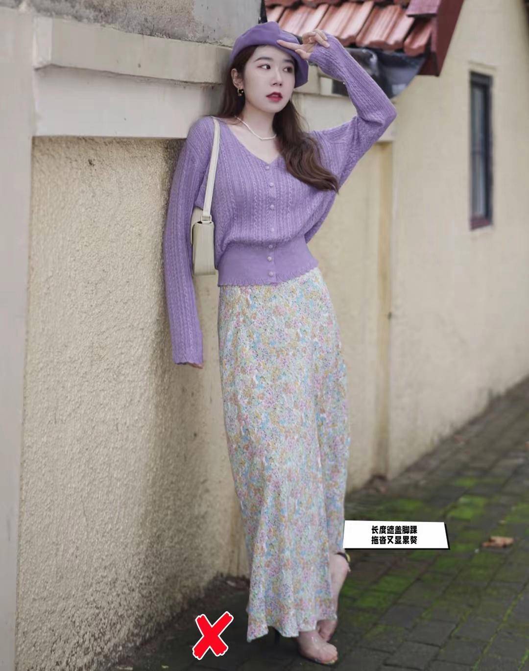 大家看下面这一套穿衣造型,用紫色的针织开衫搭配上碎花的半身裙,拍出来的照片确实很出镜,也很漂亮。 但是千万不要忽略了一个事实,我们穿衣打扮是需要在现实生活中走来走去的,如果你的裙子像他这么长的话,走路也不方便,而且身高比例比较矮的情况下,穿拖地裙会很压身高。