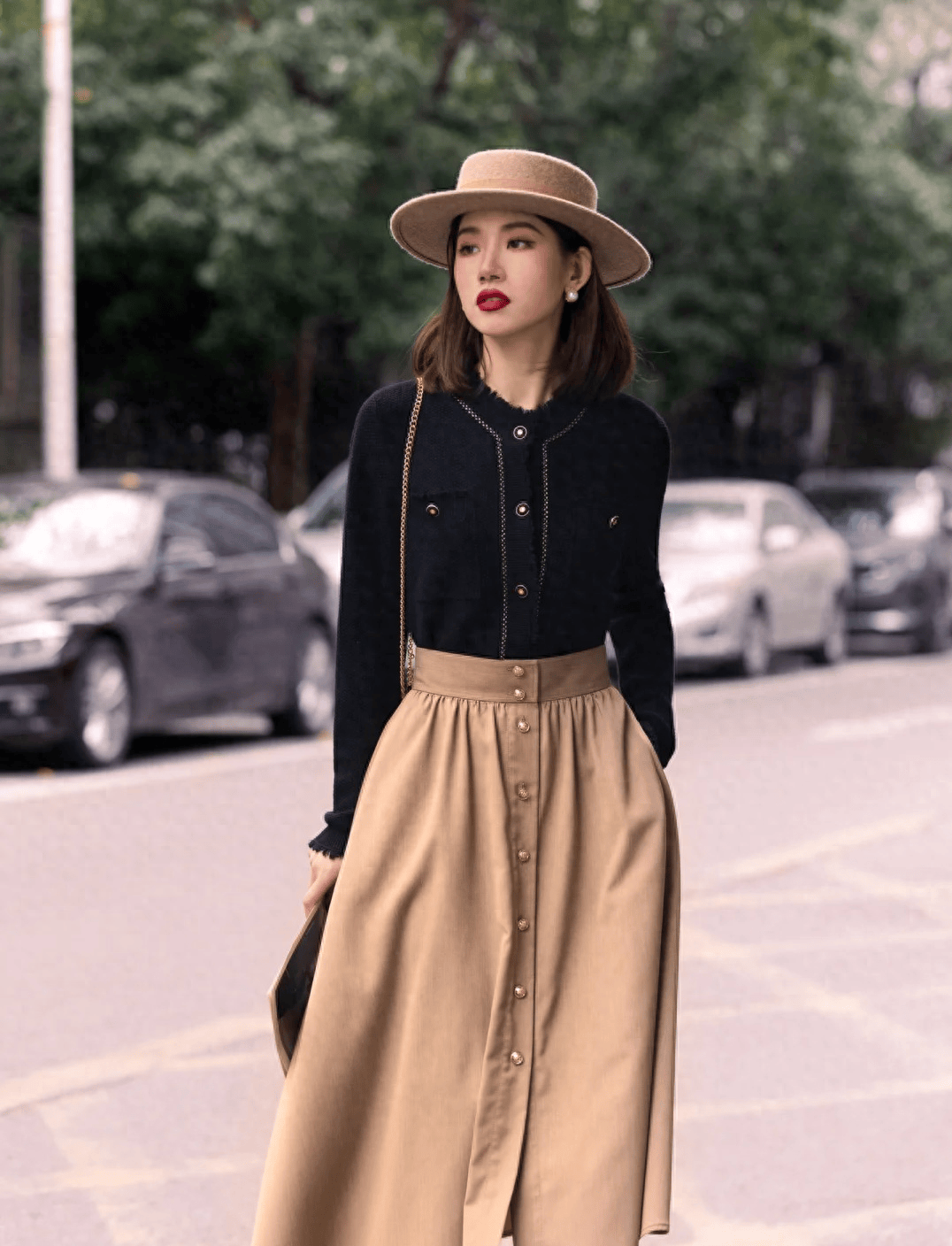 穿衣打扮不光是上衣和裙子的问题,有的时候想让整个造型更精致,配饰是少不了的,比如像下面这位博主选择了贝雷帽和墨镜点缀,就是为了营造整个穿衣打扮造型的氛围感,看起来确实更加的精致。