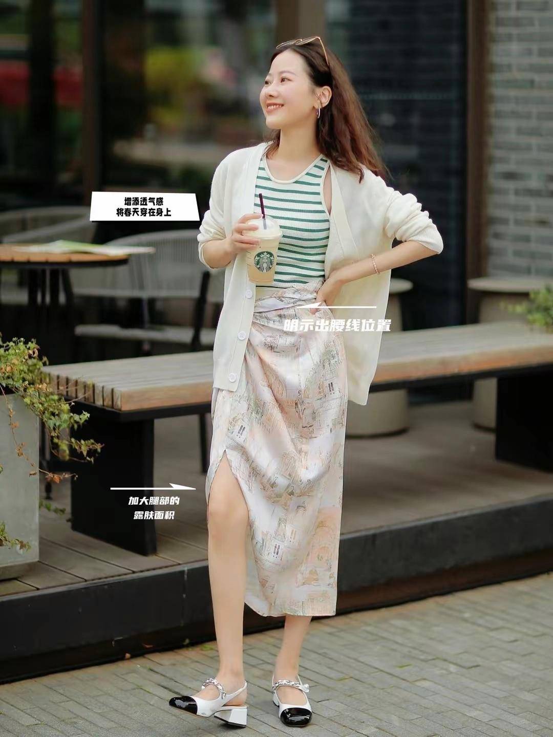 首先,自然选择的针织开衫是属于薄款,而且面料透气性好像下面这位素人穿的造型里面还选了条纹的背心作为内搭,会更加的凉快,下半身穿的这条半身裙大开叉的设计增加了路弧度,更加的凉快舒适。