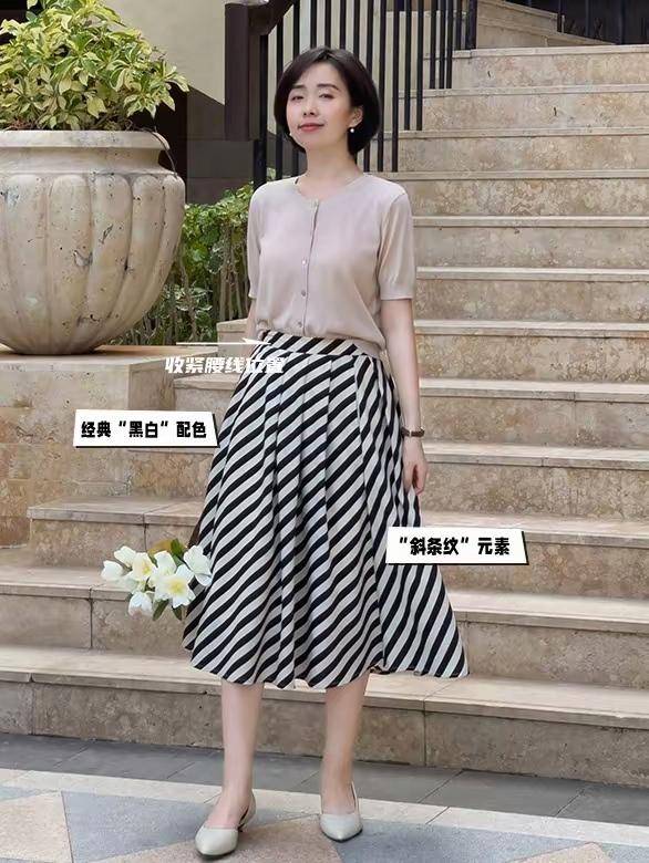 我们还可以选择有条纹元素的半身裙来搭配,就像下面这一身穿搭就用的是斑马线的伞状半身裙,搭配上一件浅紫色的针织开衫,脚上踩了一双低跟鞋,经典优雅的穿衣风格就出来了,小个子女生也很值得借鉴,这一身穿搭造型。