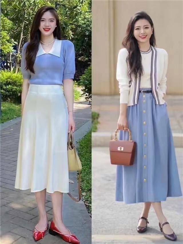 上半身的针织衫颜色和裙子的色彩不同,组合在一块形成一个撞色的效果,层次感分明,比如像下面第一位素人博主,用的是浅蓝色的针织短袖上衣,搭配白色的高腰收腰半身裙,把上衣扎进班长群里面,轻松的提升腰线,形成三七分的身材比例,清爽干净利落,出门旅游拍照很出片。