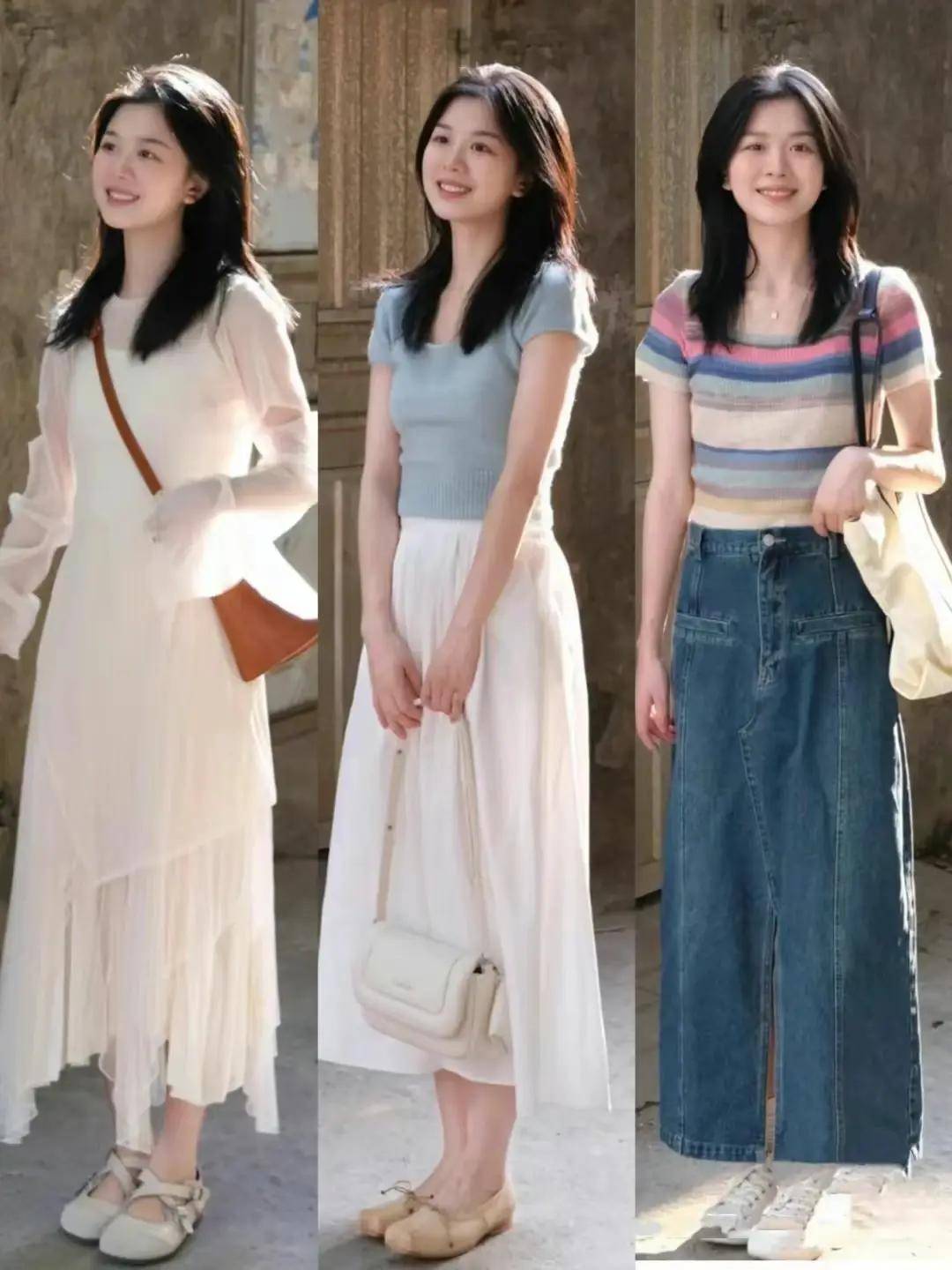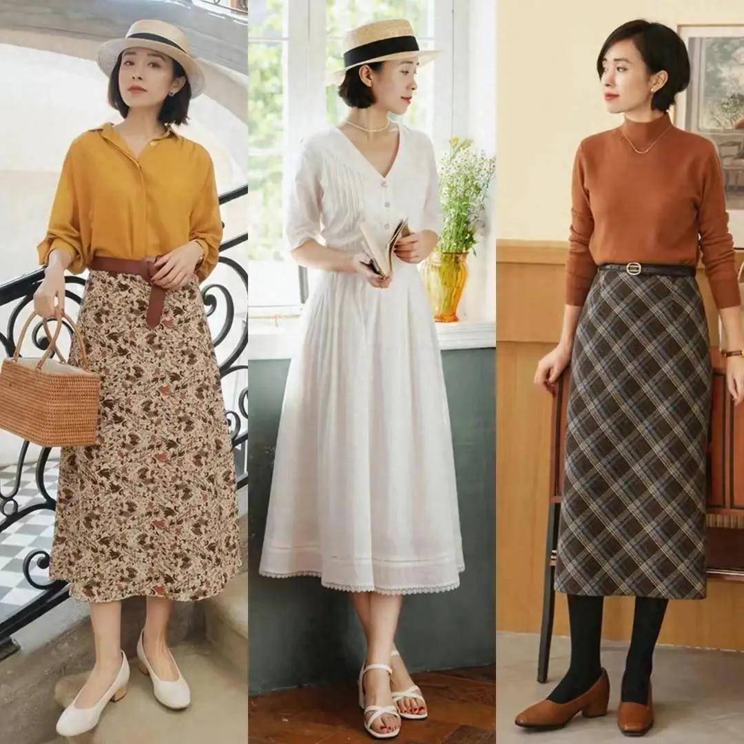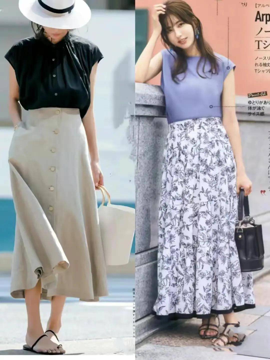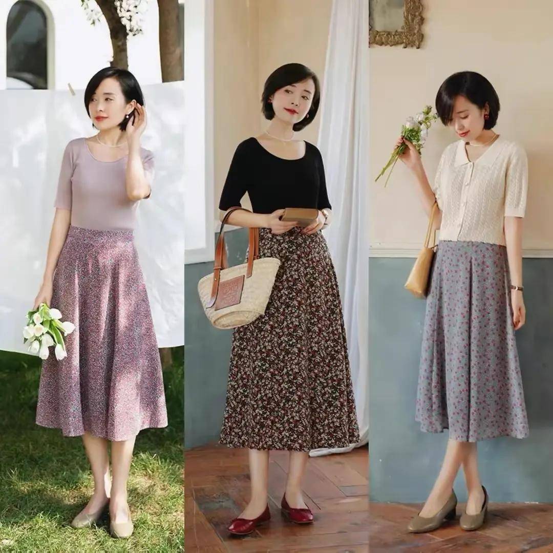 我们在穿衣打扮的时候,尽量把繁琐的衣服单品往下移,就像下面这三套的穿衣示范,下面都是属于碎花的半身裙,图案设计比较繁琐,如果你把它上到上半身的话,就会显得太过于花哨。