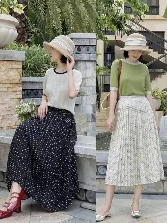 就像下面这一套穿衣示范就很不错,分别用了一件白色的针织开衫,搭配上黑色的波点伞状半身裙,经典耐看,如果想要更抢眼,可以用绿色的针织短袖搭配上白色的波点百褶半身裙,轻松散发出女性魅力。
