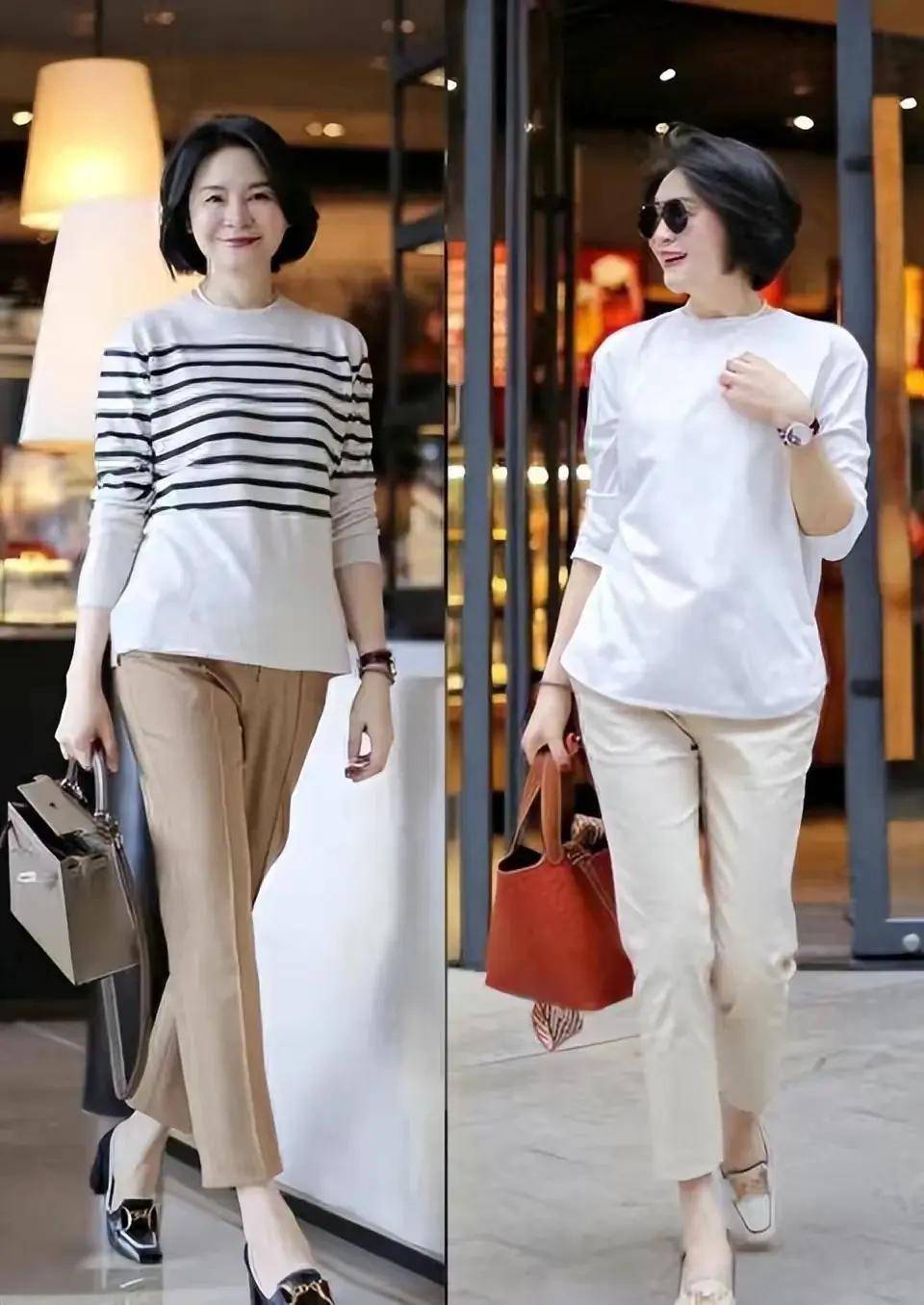 比如像下面这两套穿搭,用了条纹的针织上衣搭配上卡其色的九分西裤,脚上踩的一双黑色的乐福鞋或者是白色的上衣,搭配上浅杏色的九分长裤,这样的穿搭确实更大气。