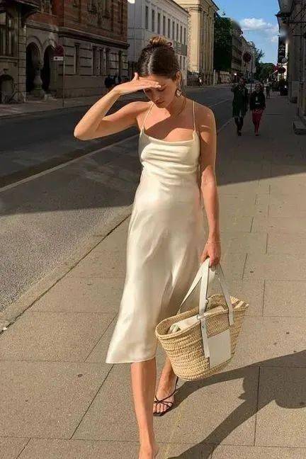 休闲感缎面裙搭配简约设计的拖鞋,日常休闲时间可以这样穿。如果是上班穿,可以搭配猫跟鞋。