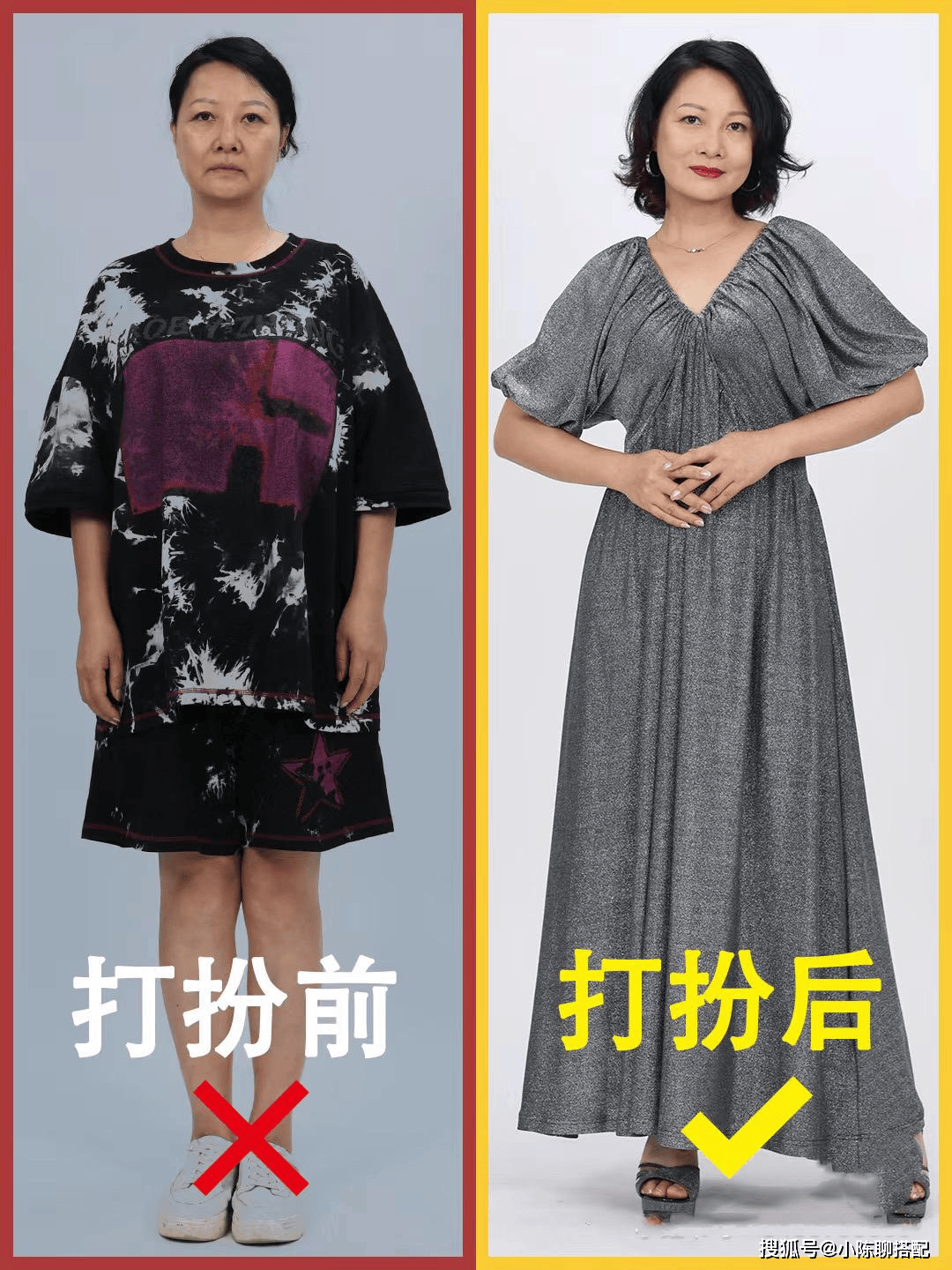 以前会觉得,女人上了年纪,要保持好的身材,穿着才会更好看。但是看了很多时尚妈妈们的穿搭,我发现,其实比起身材长相,“扬长避短”才更重要。 比如这位中年妈妈,宽松肥大的T恤裙显得整个人很臃肿肥大,而换了略微收腰且有腰线的裙子后,整个身形肉眼可以看出小了很多。