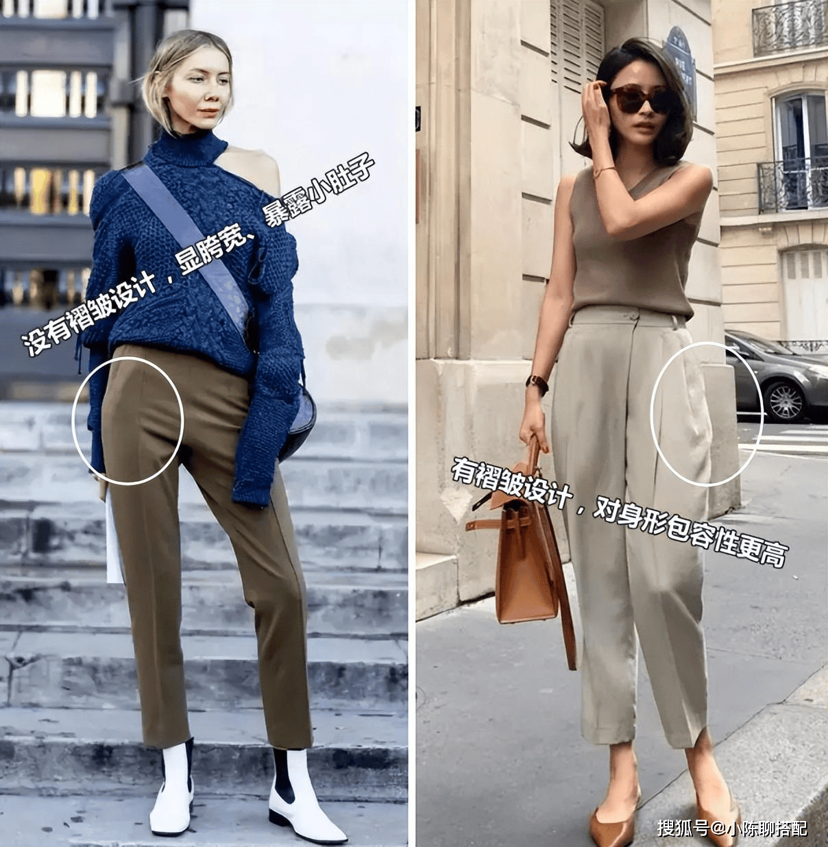 另外,日常我们在选择一些宽松或材质比较软的裤子时候,像有小肚子的女性,就不要选择腹部过平的设计,而要选择带有褶皱设计的,这样才不会让小肚子直愣愣的暴露出来。