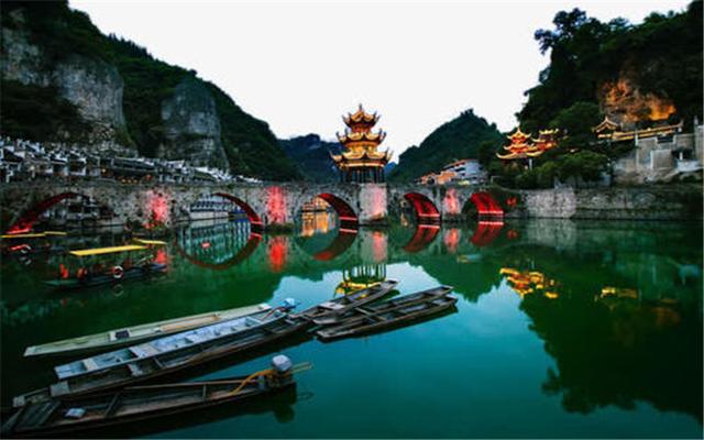 整个古镇都是依山而造,人造建筑与山里的悬崖,青藤,古树和洞穴融为一体,相得益彰,竟然毫无违和感,多一分则嫌多,少一分又不足,古人的建造技术真的是太高明了,不得不佩服,难怪有那么多国外富豪邀请中国的造景师为自己的豪宅设计中国元素。这里还有一条舞阳河,动静皆宜,安静的时候河面平静的如同一面镜子,但是走几步前面又是蹦腾的瀑布,形成了很强的视觉冲击。