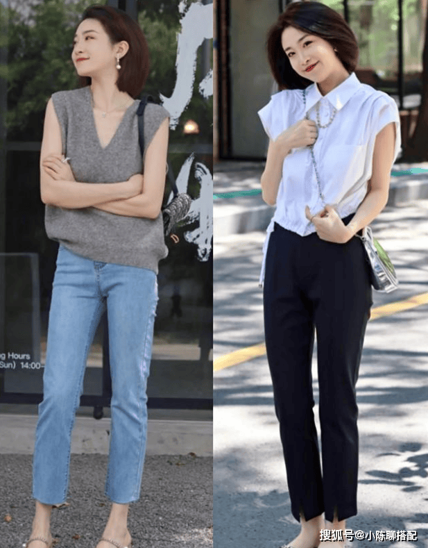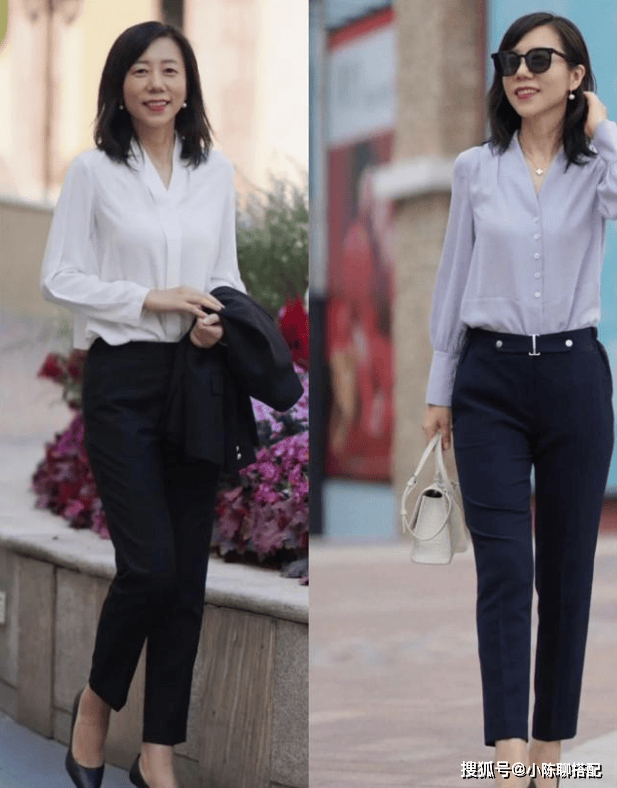 像下图这种利落的西装裤,上衣就不能选择休闲的T恤或者热辣的背心。反之如果选择衬衫或者雪纺衫,搭配带跟的小黑鞋,既能修饰出较长的身形,还能给人一种精英又干练的感觉。
