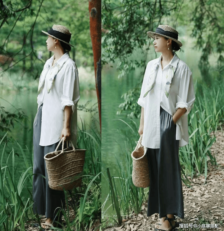 除了上图这种直筒裤,像九分阔腿裤也是我们的不二选择。因为阔腿型的裤子通常多为轻盈材质制成,更适合爱出汗、怕热的女性