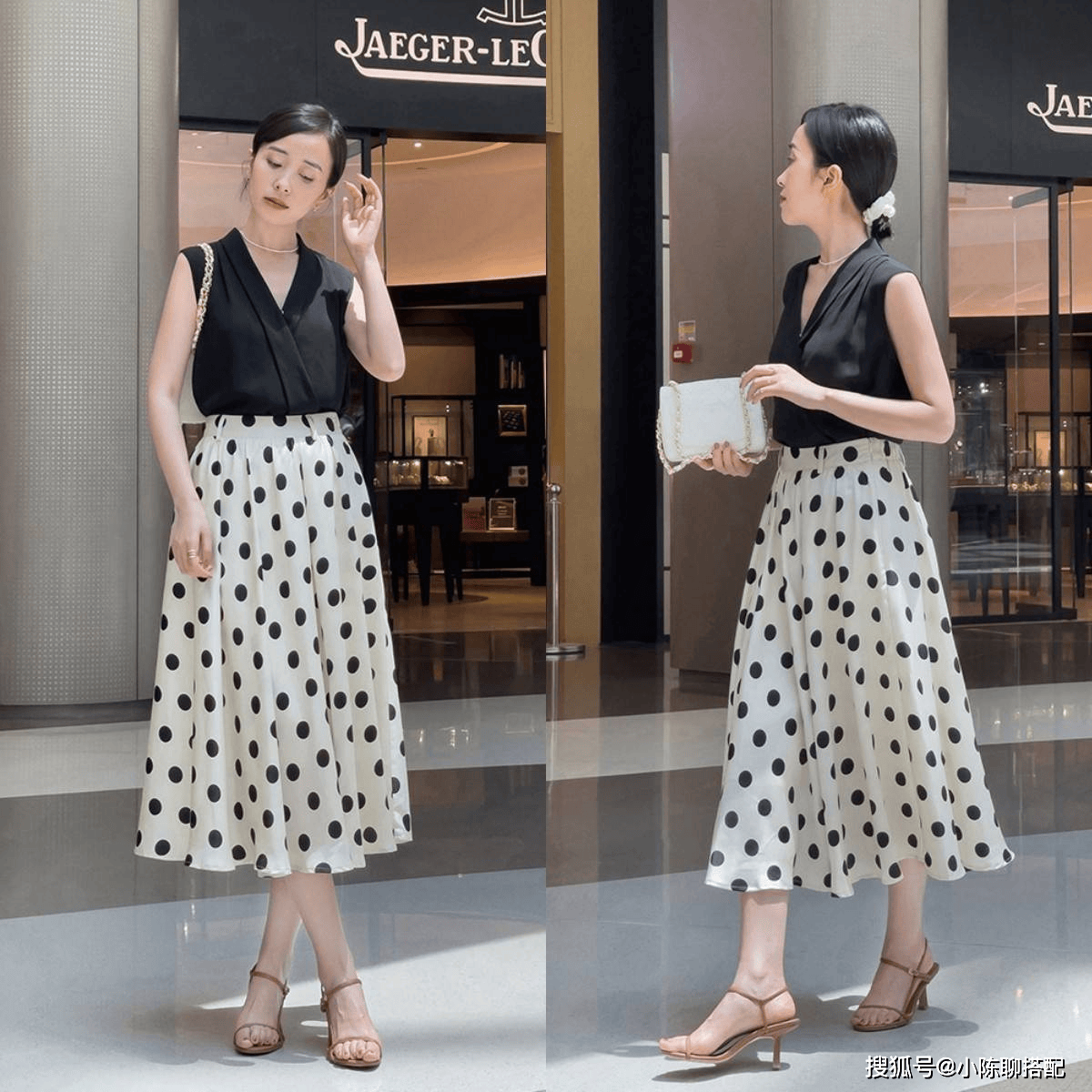 当然,如果你不喜欢成熟女人味的风格,也可以看看A型波点半身裙。可以说A字的版型,特别适合梨形身材的女生。既能突出纤细的腰身,还能遮住粗粗的大腿和不笔直的腿型。