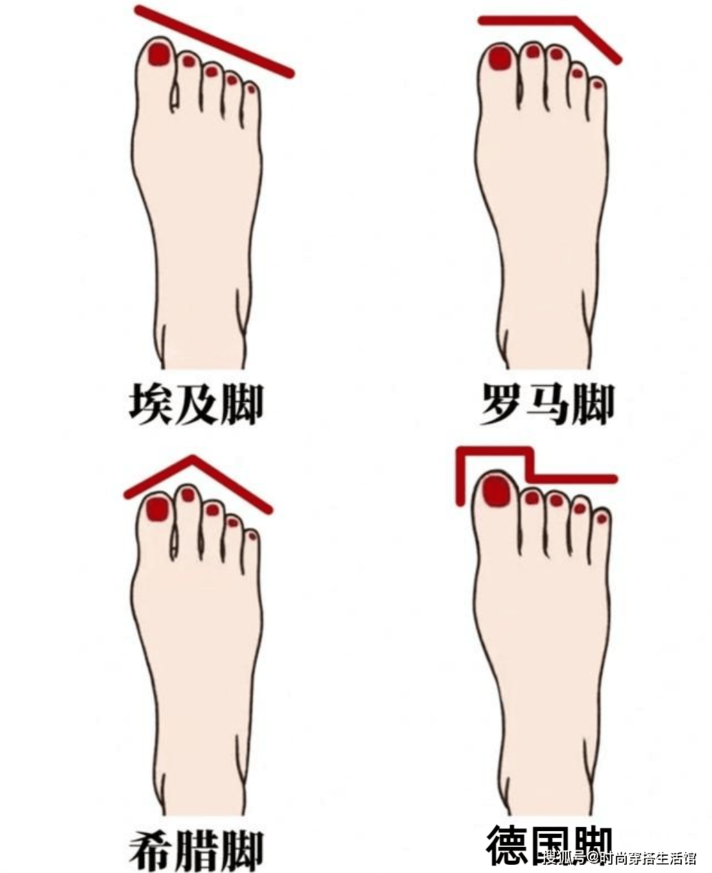 埃及脚的姐妹就多穿斜尖头和斜圆头的设计;希腊脚完全是为各种尖头鞋而生;罗马脚更适合宽圆头、平头鞋;德国脚适合露趾鞋、方头和圆头等鞋尖空间较大的设计。