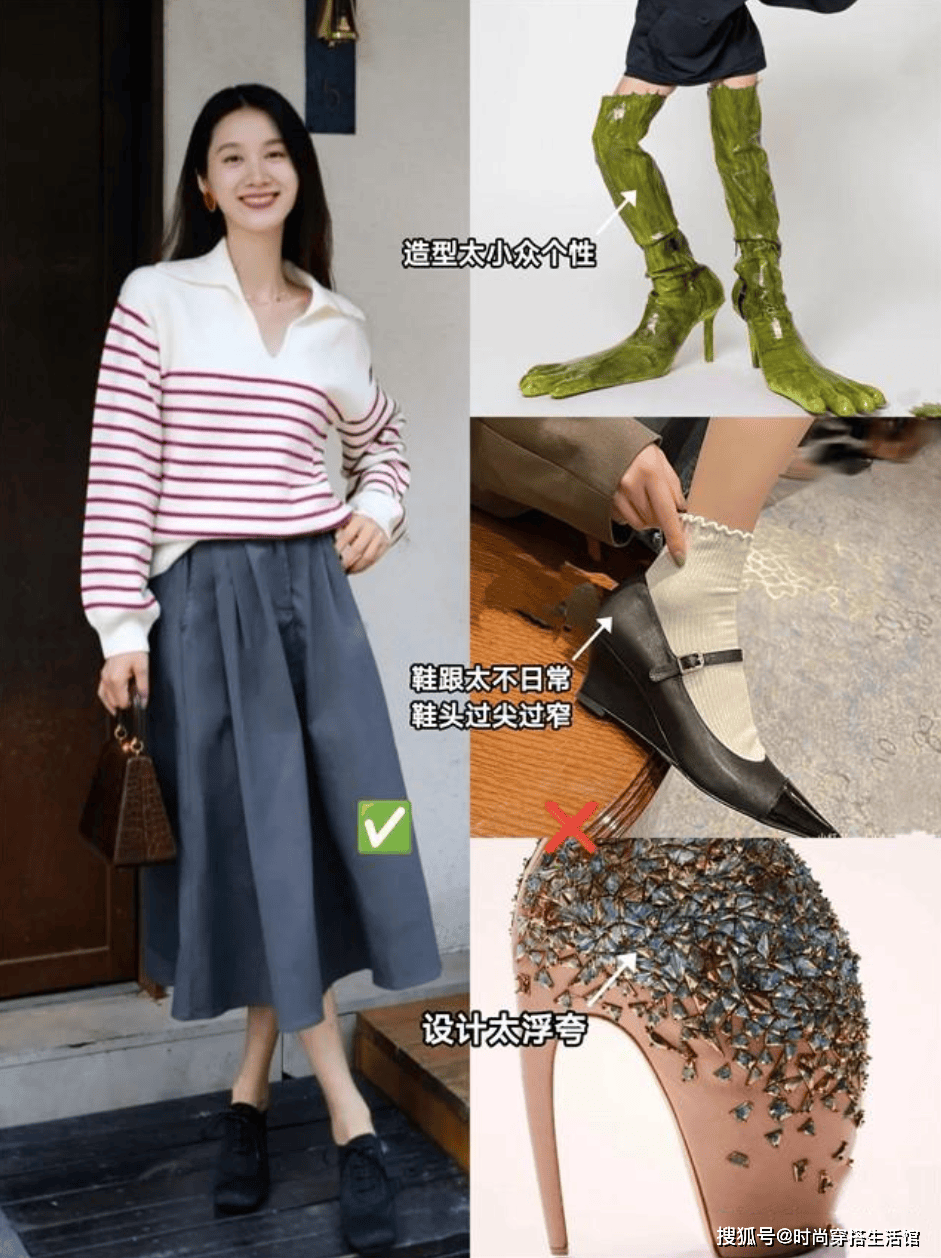 鞋子不仅要百搭还需要好穿,不要刻意的追求洋气的设计,有些鞋子看似好看,但是却是土气又难看的。鞋子在穿搭中属于重头,但款式不能太花哨,带珍珠装饰、亮片、大蝴蝶结,可以增加视觉的美感,但如果流行元素一下子加了太多,设计过多反而会破坏鞋子的版型,穿起来显得人十分沉重笨拙!