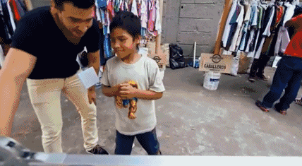 小男孩一时高兴得不知道该怎么办, 这是他第一次走进“商场”。