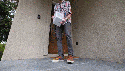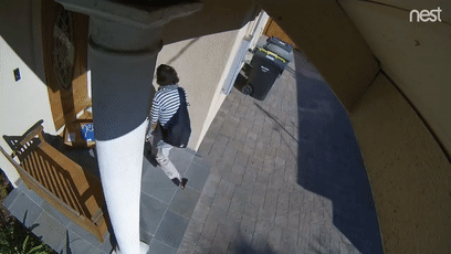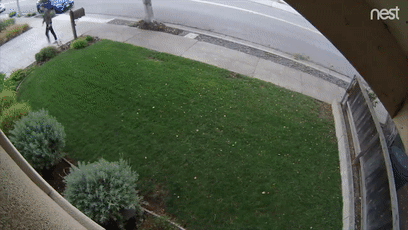 第一个小偷是一个穿运动裤小伙,他从 Mark Rober 家旁边路过时,发现了门口的包裹,捡起来快步离去: