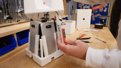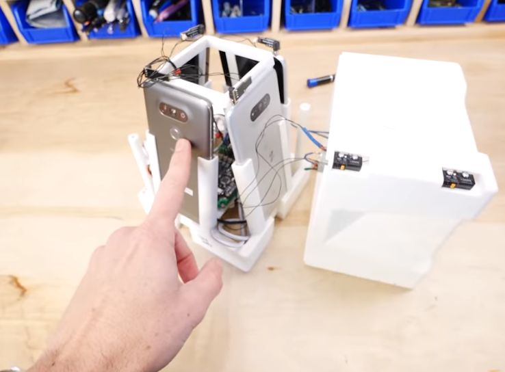 Btw,四台手机均以向后倾斜的角度安插到3D打印制作的框架中,以从下至上的倾斜角度拍摄画面: