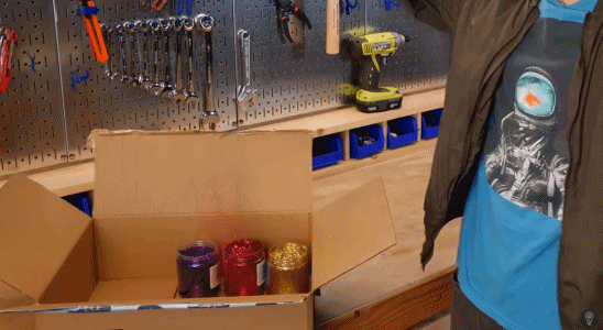 然后下一步,小哥买来足足三罐闪闪发亮的亮粉,也就是常用于美甲、眼影等的那种特别刺激的颜色。。。