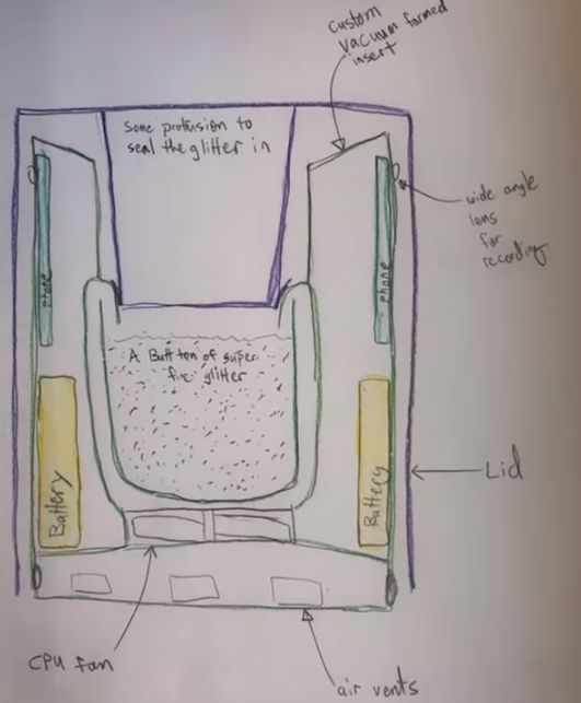 于是他设计了一个会自动喷洒亮粉的装置,当小偷打开这个包裹,就会有很多亮粉喷撒出来。草图长酱紫: