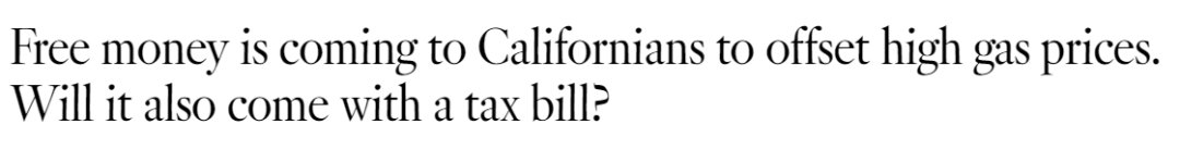 90亿美元中产阶级退税的目的是抵消高油价,但根据协议,钱将给那些达到收入限制的人,无论他们是否驾驶汽油动力汽车。要符合资格,你必须在2020年在加州居住至少6个月,并在当年提交了州纳税申报表,而且在支付退税当天你必须是加州居民。这项福利足以覆盖大约90%的州纳税人,预计需要三个多月的时间来发出所有的款项。