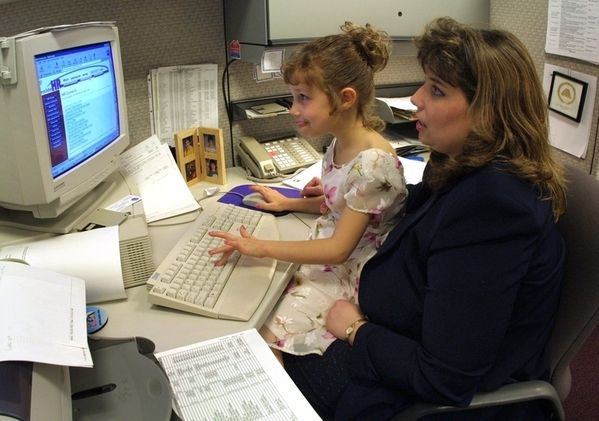 美国一位母亲在“Take Our Children to Work Day” 带孩子一同上班。(Getty Images)