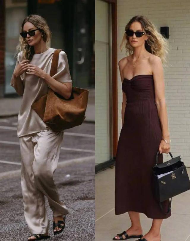 浅卡其色的缎面衬衫搭配同色系的阔腿裤,单一的配色往往更容易穿出协调高级感,浅卡其又有种亲和温婉的气质,自带柔光滤镜效果加上缎面的光泽感,更显贵,有种老钱风的腔调。