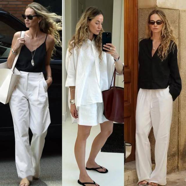 比如黑色的吊带搭配白色阔腿裤,非常干净清新的配色,带着夏日的清凉感,时髦减龄的效果也不差。