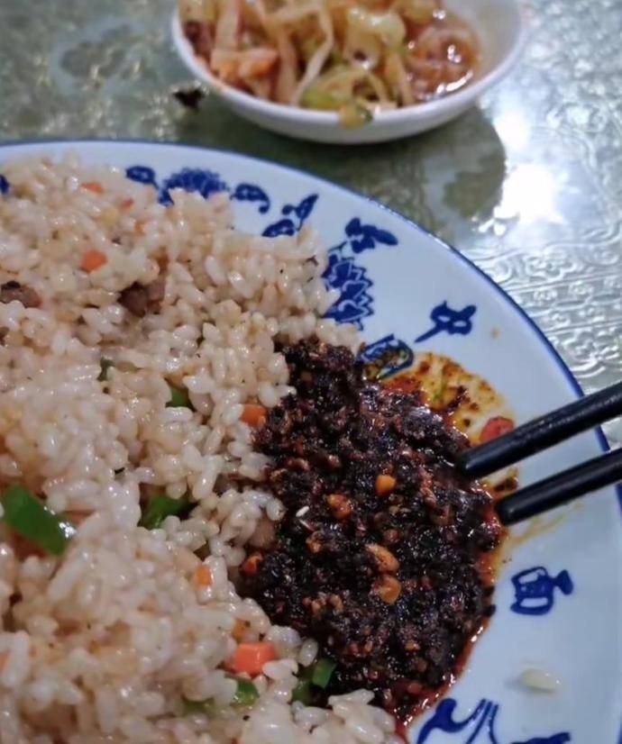 看得出来,老板真是心疼这两勺辣椒了,因为现在辣椒价格比较贵,有的地区不比肉便宜,十几块一斤算低价了,而且辣椒油的制作过程也挺费时费力的,可以说这点辣椒油让这碗炒饭赚不到什么钱。
