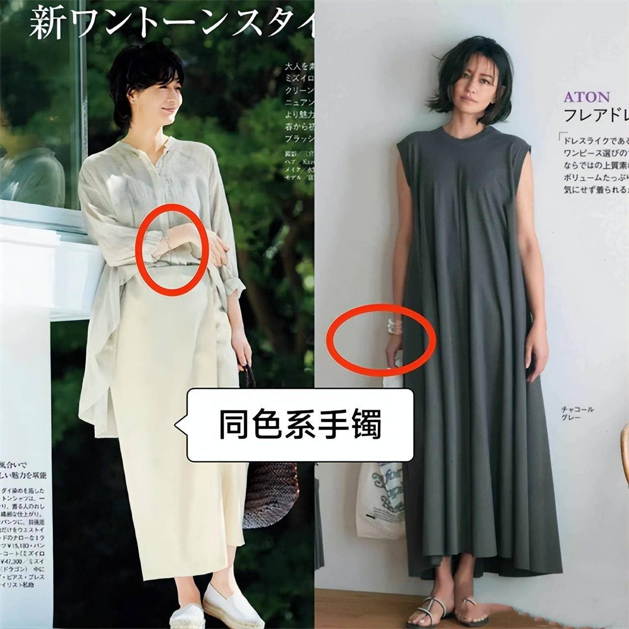 除此之外,配饰与服装的搭配也要多加注意。为了避免造型显得过分违和,推荐大家尝试一下与服装相同色系的手部配饰,像是白色系的上衣搭配米色长裙,就可以加入“偏银色调”的手链。不仅可以避免整体的色调,显得违和还能增添延续性,看起来更加的高级简约。