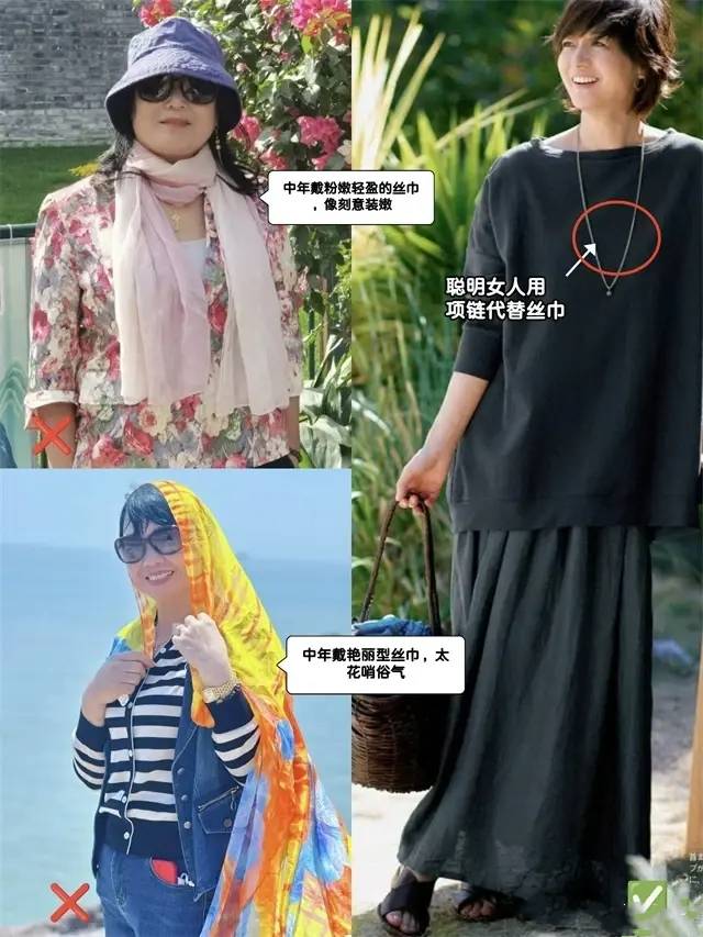 丝巾是夏季最常见到的配饰种类,不过上了年纪的女人在佩戴丝巾的时候,若是选择了太过于花哨的款式,很容易有刻意装嫩的嫌疑。另外,如果所选的丝巾颜色太过于杂乱,也会拉低造型的档次,从而让造型看上去显得十分的油腻、俗气。