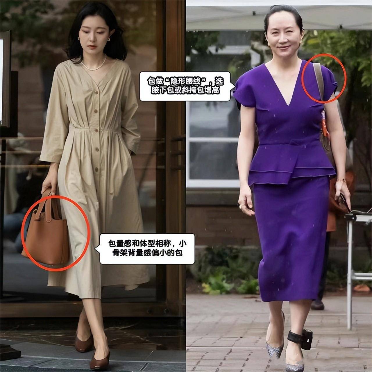 其次,若是你属于大骨架的身材,则要多尝试“体积稍大”一些的包包,但为了避免造型显得过分违和,要多尝试腋下包或者是斜挎包,将包包夹在腋下、只露出包带,看起来会更加的利落。