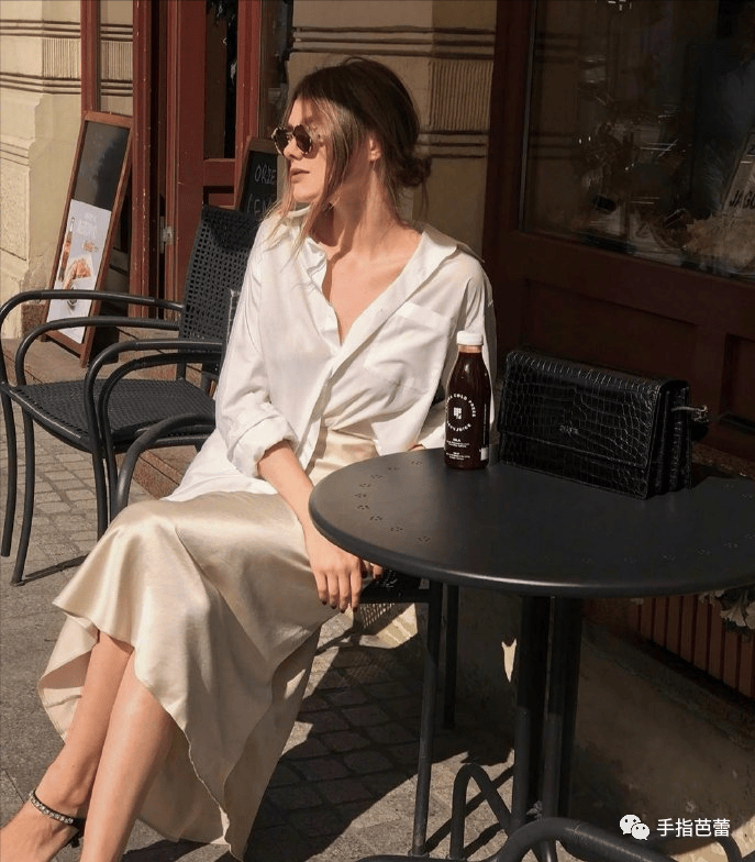 高雅的视感,来自于配色和面料的双重配合。一件米白色衬衫与米色半身裙搭配,泛着光泽的淡雅将优雅和精致一 一书写。富有女人味的组合,最怕的就是老气横秋!