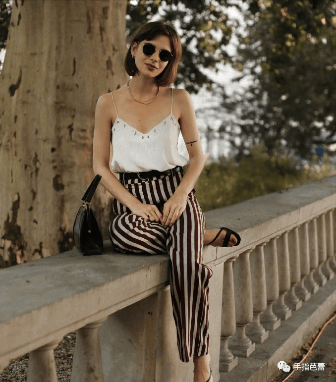 素雅的上衣与条纹裤子,营造出简繁的张力,时髦还低调。
