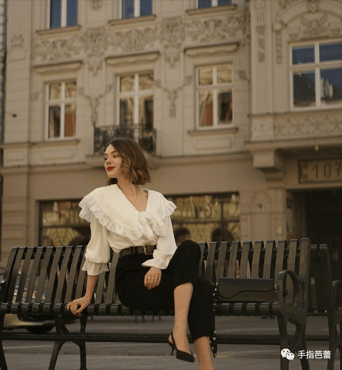 大翻领、大袖子的甜美上衣,俏皮可爱涌现,用小黑裤的正式感来调和,适宜恰当。