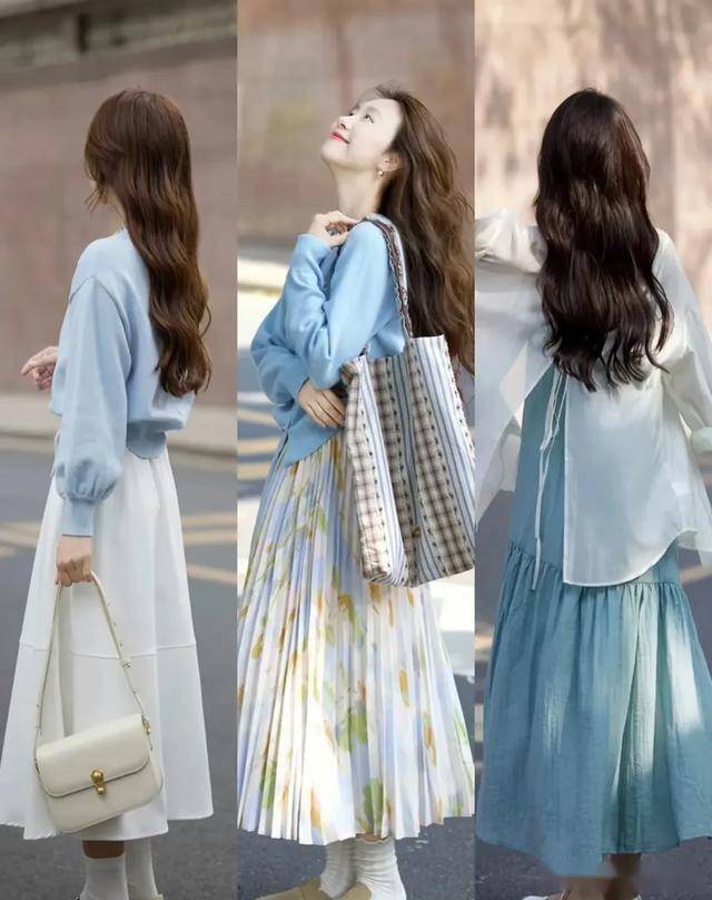 天空蓝色的针织衫,温温柔柔的,搭配了轻盈飘逸的白色印花百褶裙,给人一种很乖巧清甜的味道,特别适合轻熟系女生,穿起来干干净净的,特别有少女感。
