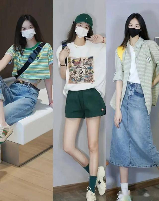 浅薄荷绿色的条纹衬衫叠穿白色T恤,特别干净清新的配色,带着学院风的清纯感,配上牛仔裙与小白鞋,整套配色特别干净,很耐看。
