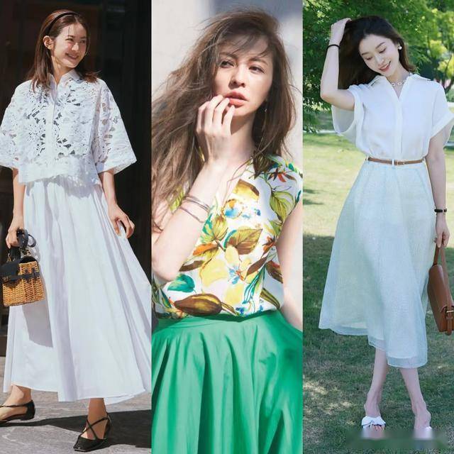 白色小衫,清清爽爽的很干净,搭配薄荷绿色的长裙,增加了轻盈又清凉的感觉,既有女人味又显得端庄高级。