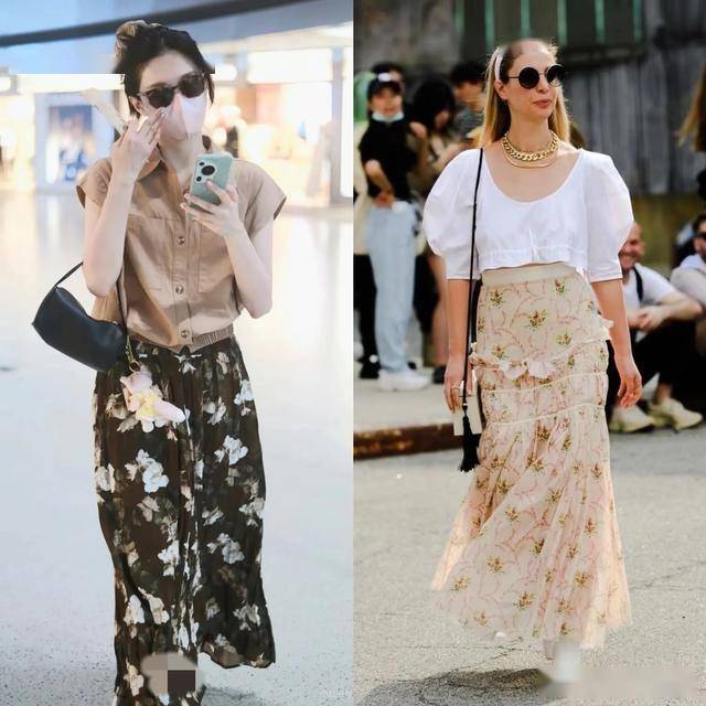 纯色系的衫与碎花长裙搭配起来,简直太浪漫了,轻松穿出不费力的浪漫氛围感。