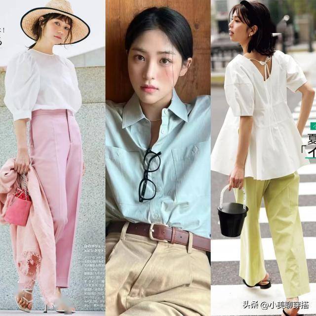 白色小衫,可以搭配粉色的阔腿裤,配色清甜温柔,很治愈的配色,减龄效果也OK,也可以搭配鹅黄色的阔腿裤,更小清新了。