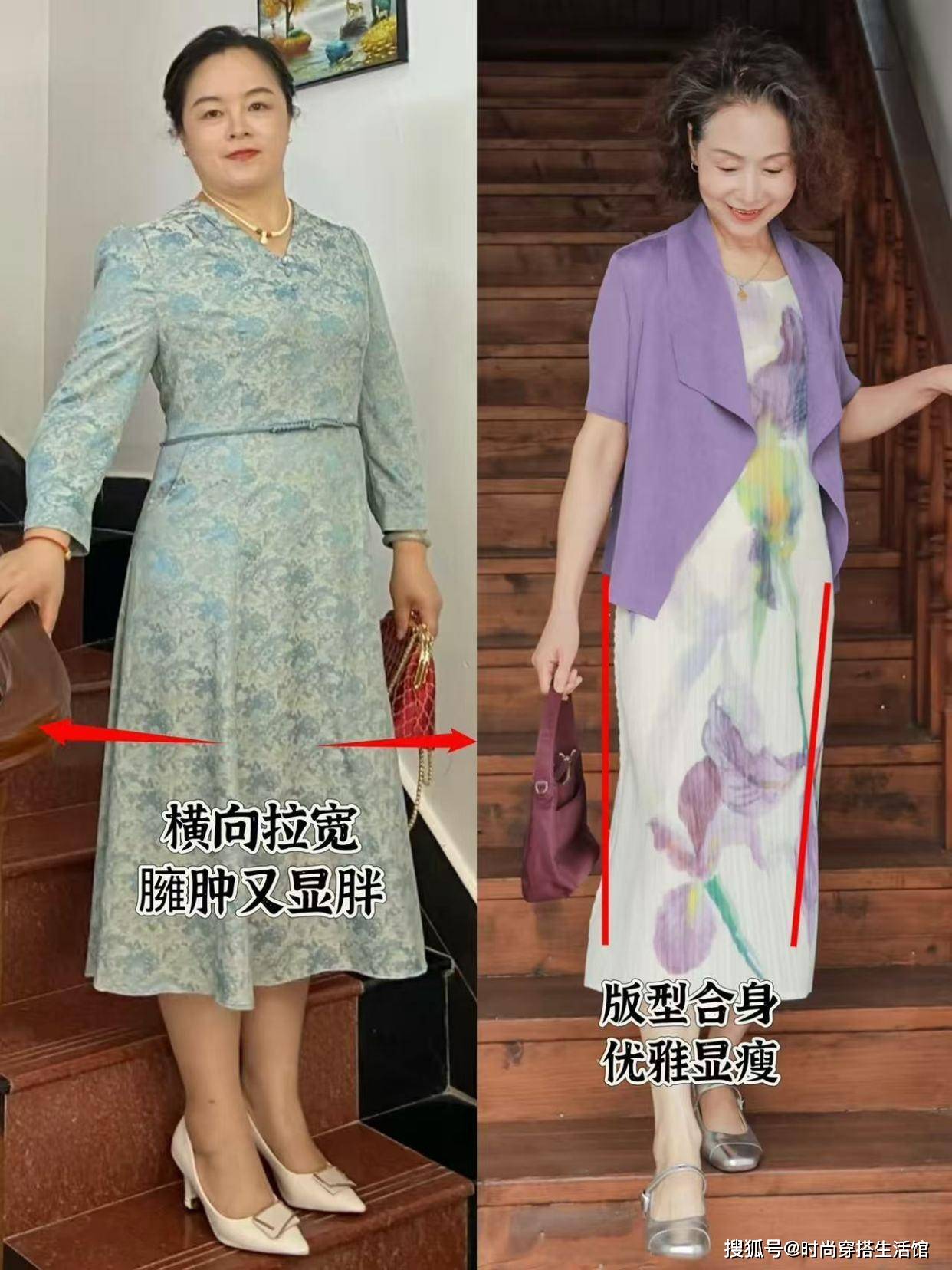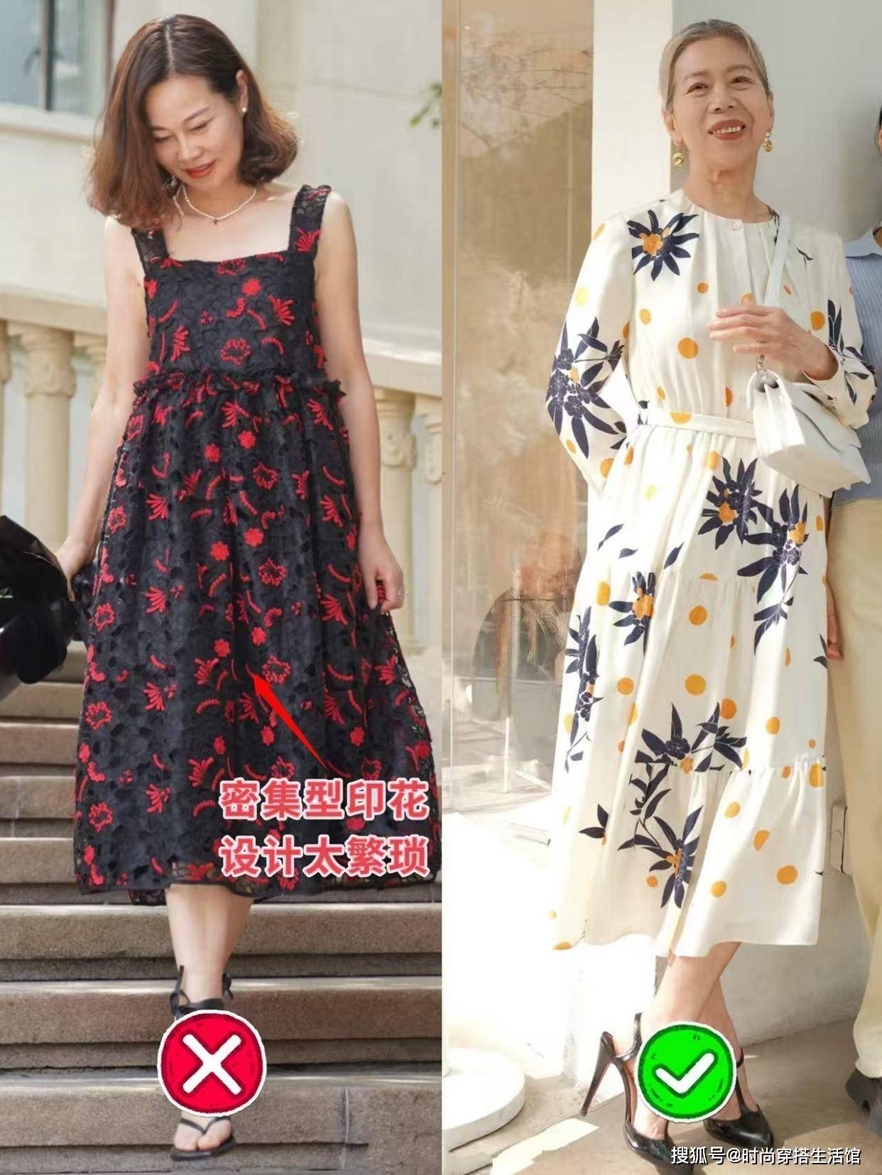 像是印花裙、碎花裙叫作标准的“中国式大妈裙”,其关键的一点是因为颜色太过于鲜艳和花哨、元素又比较繁琐和复杂,像是大红大绿、印花刺绣堆砌在裙身,视觉冲击效果显花哨。尤其是很多上了年纪的女性,非常喜爱穿这种花裙子,戴上丝巾和墨镜,自以为时髦洋气,实际上艳俗又土气。