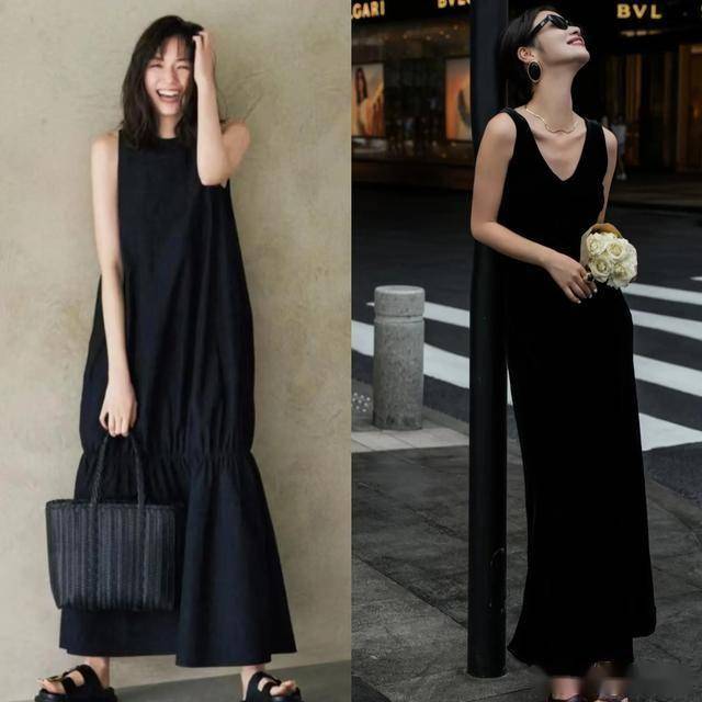 胳膊纤细的女生,可以尝试黑色背心连衣裙,版型可以宽松一些,有种慵懒风的味道,穿起来又特别清凉舒服,搭配黑色的包包与黑色鞋子,单一配色看起来更加高级。